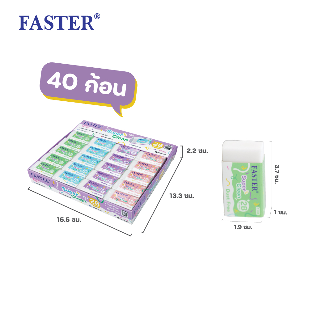 ยางลบดินสอ ซุปเปอร์ คลีน ฟาสเตอร์เนื้อยางลบสีขาวเศษยางลบจับตัวเป็นก้อนสามารถลบดินสอ 2B ได้1 กล่องบรรจุ 40 ชิ้น ขนาดยางลบ : 3.7 X 1.9 X 1 ซม.ขนาดกล่อง : 15.5 x 13.3 x 2.2 ซม.